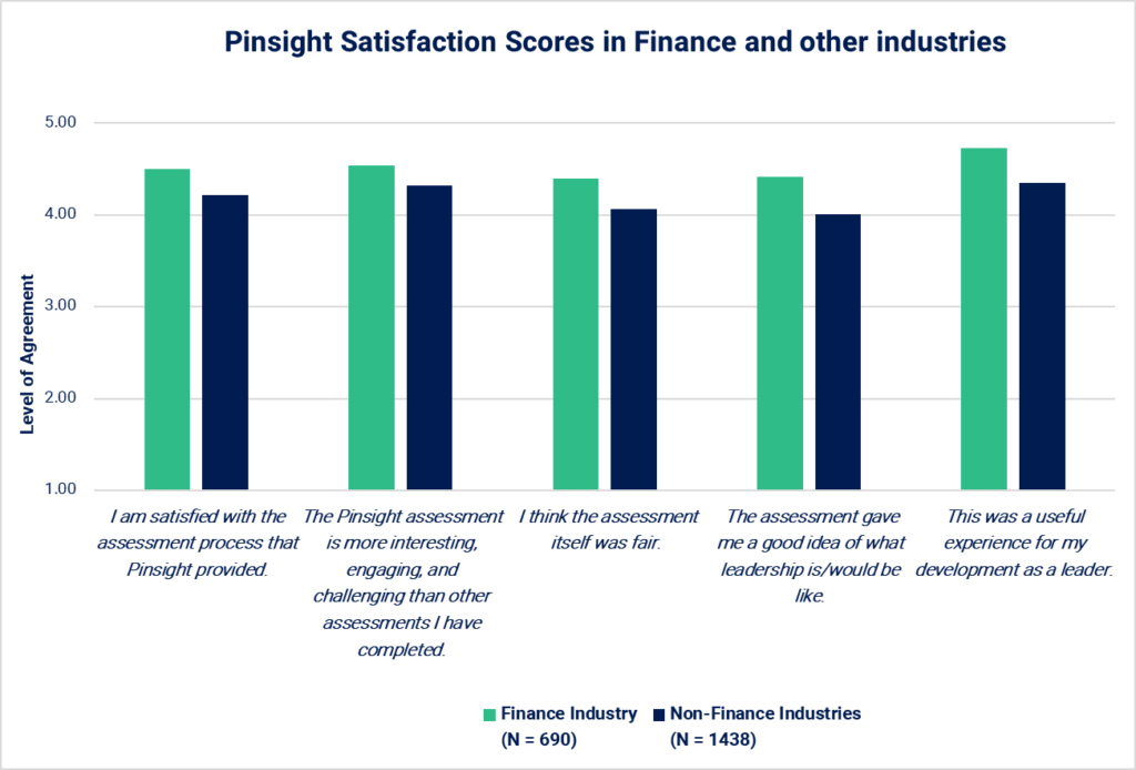 Finance participants reported the highest satisfaction with the overall assessment process, during which they complete a virtual simulation of a “day in the life” of a leader in a new organization. The simulation includes live role-plays with trained assessors and the opportunity to receive detailed feedback about their performance, including a custom skill development plan.