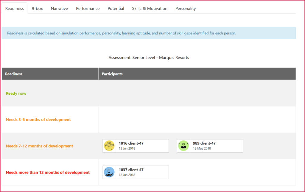 - Some of the reports can be used to compare participants (readiness, 9-box, bench), so if you have selected more than one participant you will see these comparisons automatically in those reports.
