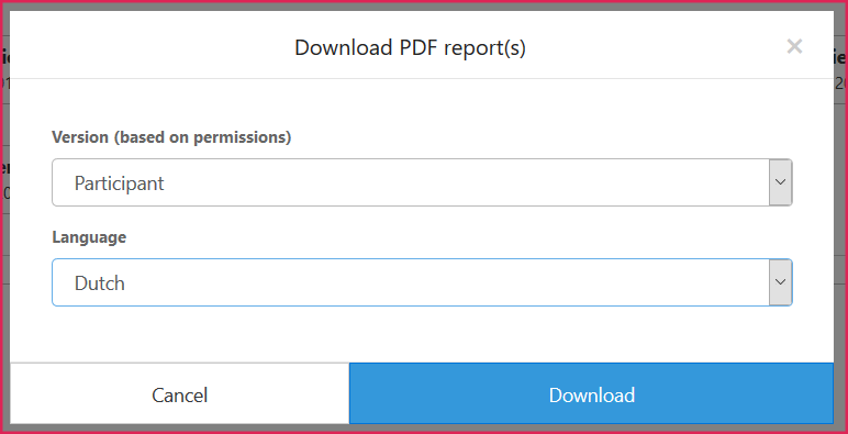 - You may choose to download a participant report or a stakeholder report in English or the language the assessment was taken in.