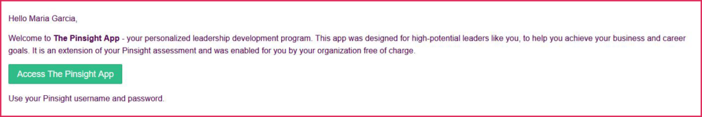 Click the Access The Pinsight App button in your invitation email to log in to app.pinsight.com and start using the app on your desktop browser. This is the same website and login credentials you used to complete your assessment.