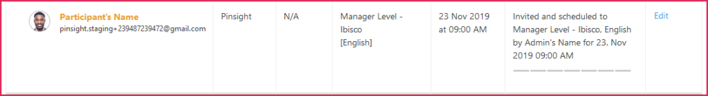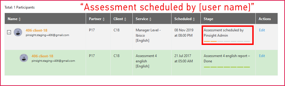 - The stage column in the participant table in the Users module indicates if a manual schedule has taken place using this text: Invited and scheduled to [assessment name, language] by [Admin’s Name] for [dd. month yyyy 00:00 AM/PM]