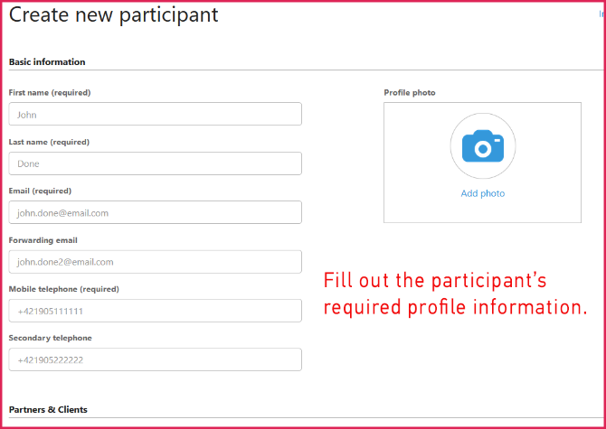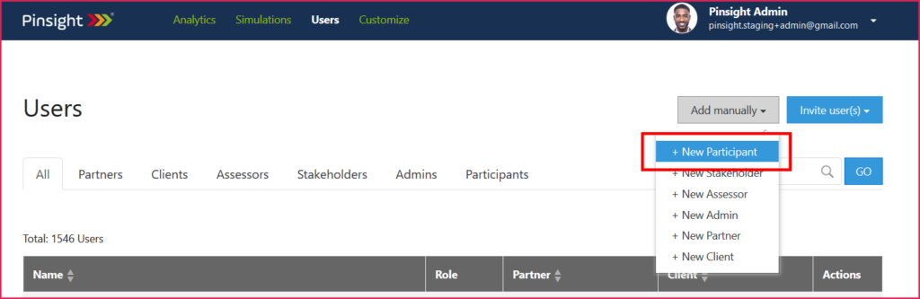 - Click the Add manually – +New Participant button in the Users section of the platform.