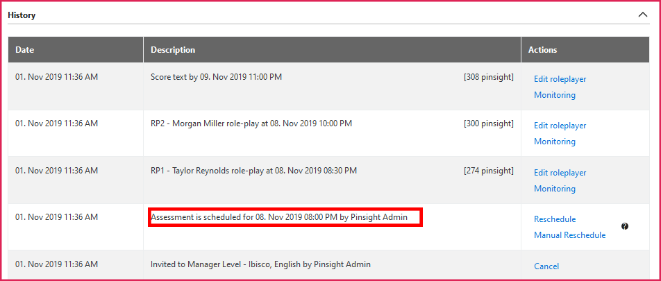 - The participant table in user management and the participant’s history table updates and indicates that manual schedule has taken place, and which admin performed the manual schedule. The history table and user management table will read “Assessment scheduled by [admin’s name].”