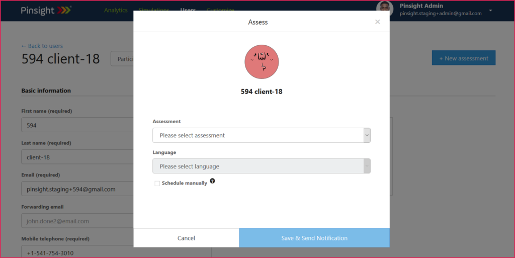 Manual scheduling allows the admins to schedule a new assessment for the participant. This can be done when inviting the participant via the Add manually – + New Participant button on the main user management screen. It can also be done in the participant’s existing profile via the +New Assessment button if it is active.