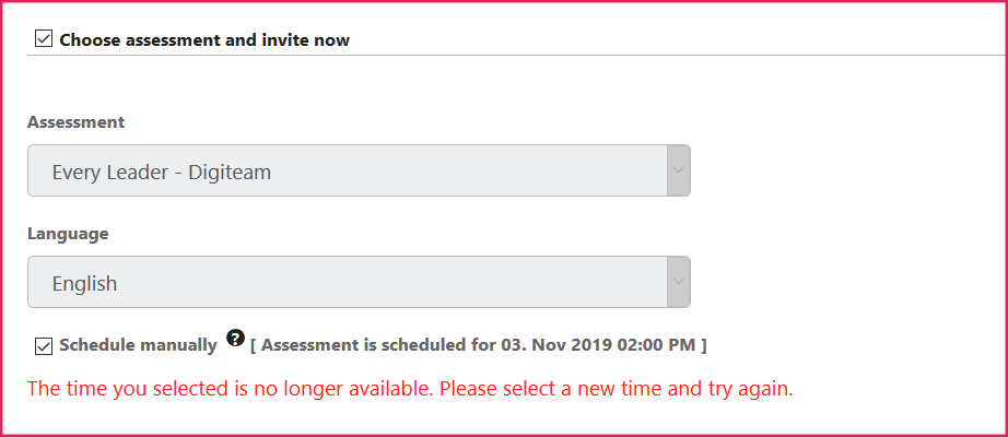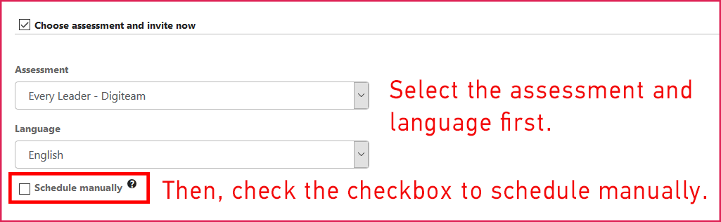 - Check the checkbox next to the Schedule manually option under the assessment and language drop-down menus. Leave the schedule manually checkbox unchecked if you would like the participant to schedule the assessment on their own.