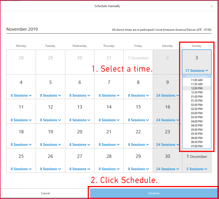 - A window appears with a scheduling calendar. Select a time (1.) to schedule the participant’s assessment, and then click the schedule (2.) button at the bottom of the window. The scheduling calendar shows times in the participant’s time zone, not the time zone set in for your admin account. The manually scheduling feature shares the same time slot rules as a regular schedule scheduled by the participant in that you are not allowed to schedule within the 48-hour window. If there are no time slots available, it is likely that there is not enough assessor availability. Please contact your Pinsight representative to resolve this issue.