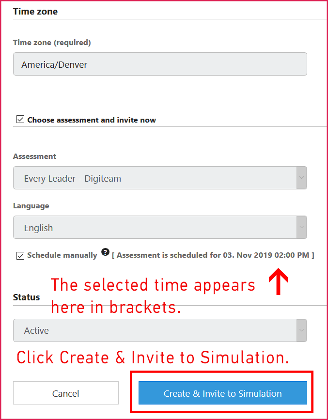 - After clicking the schedule button, the time and date of the assessment will appear in brackets next to the schedule manually checkbox. You may now click the create & invite to simulation button at the bottom of the screen.