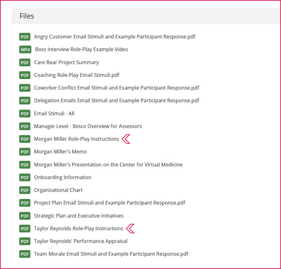 4. Scroll down to the Files section. This section lists out all of the simulation materials, role-play instructions/scripts, and other resources for download and/or viewing.