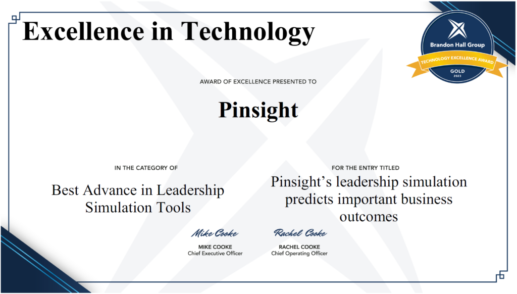 Pinsight, a leader in innovative leadership assessments and development solutions, won a coveted Brandon Hall Group Gold award for excellence in the “Talent Management – Best Advance in Leadership Simulation Tools” category.