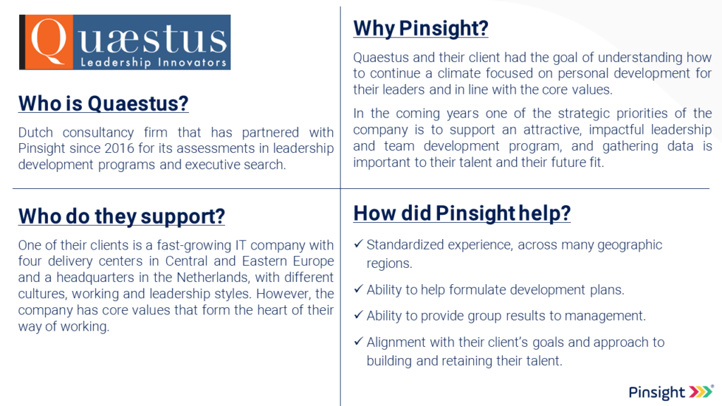 “Quaestus Leadership Innovators is a Dutch consultancy firm that has partnered with Pinsight since 2016 for its assessments in leadership development programs and executive search. One of our clients is a fast growing, dynamic IT services company with four delivery centers in Central and Eastern Europe and a headquarters in the Netherlands, entailing a mixture of different cultures, working and leadership styles. The company however does have a number of core values that form the heart of their way of working.